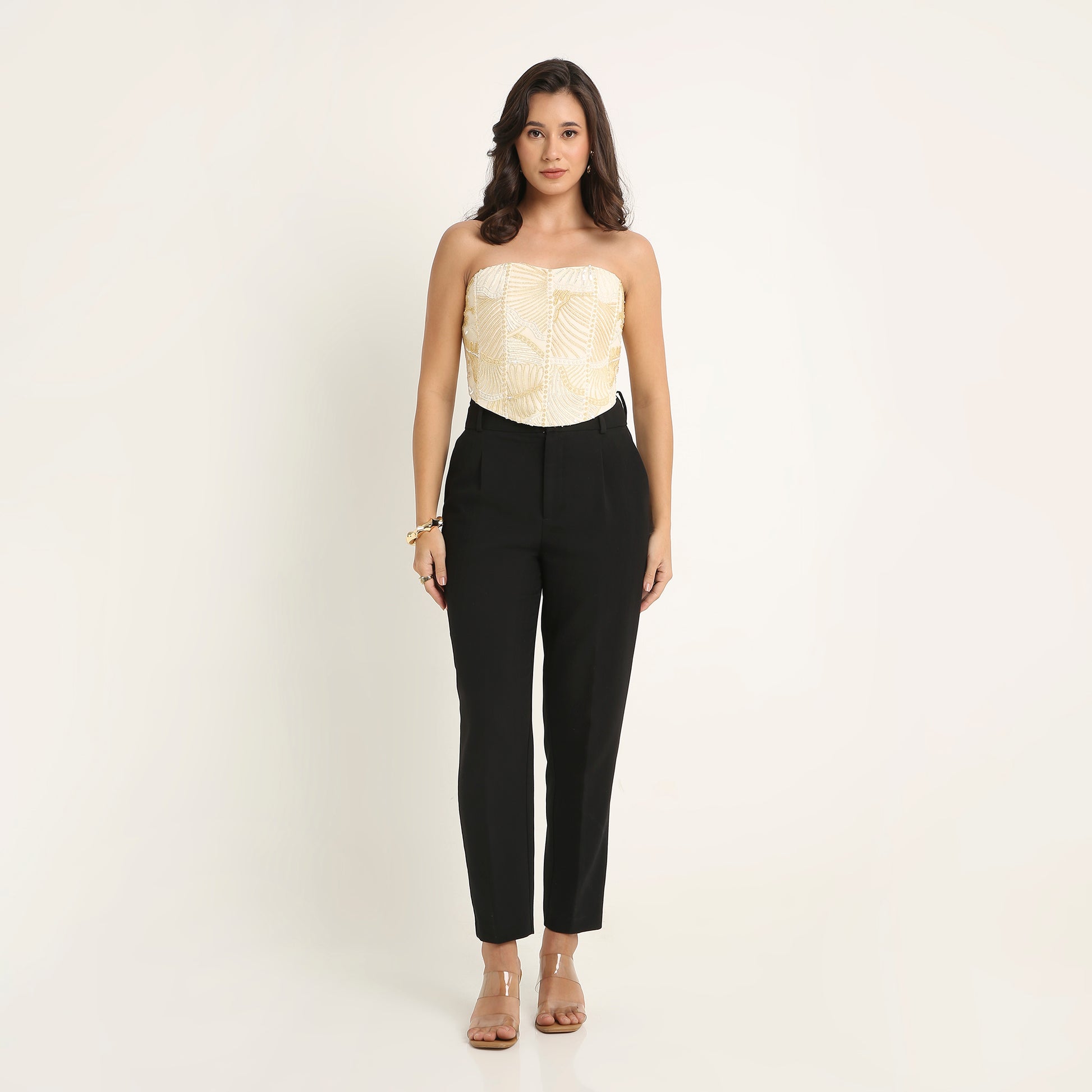 A refined strapless bustier in soft champagne, intricately hand-embellished with geometric beadwork and delicate shimmer. Designed with a structured silhouette for a flattering, sculpted fit, it pairs effortlessly with tailored separates for a modern, elevated look. Perfect for evening events, festive gatherings, or statement styling.