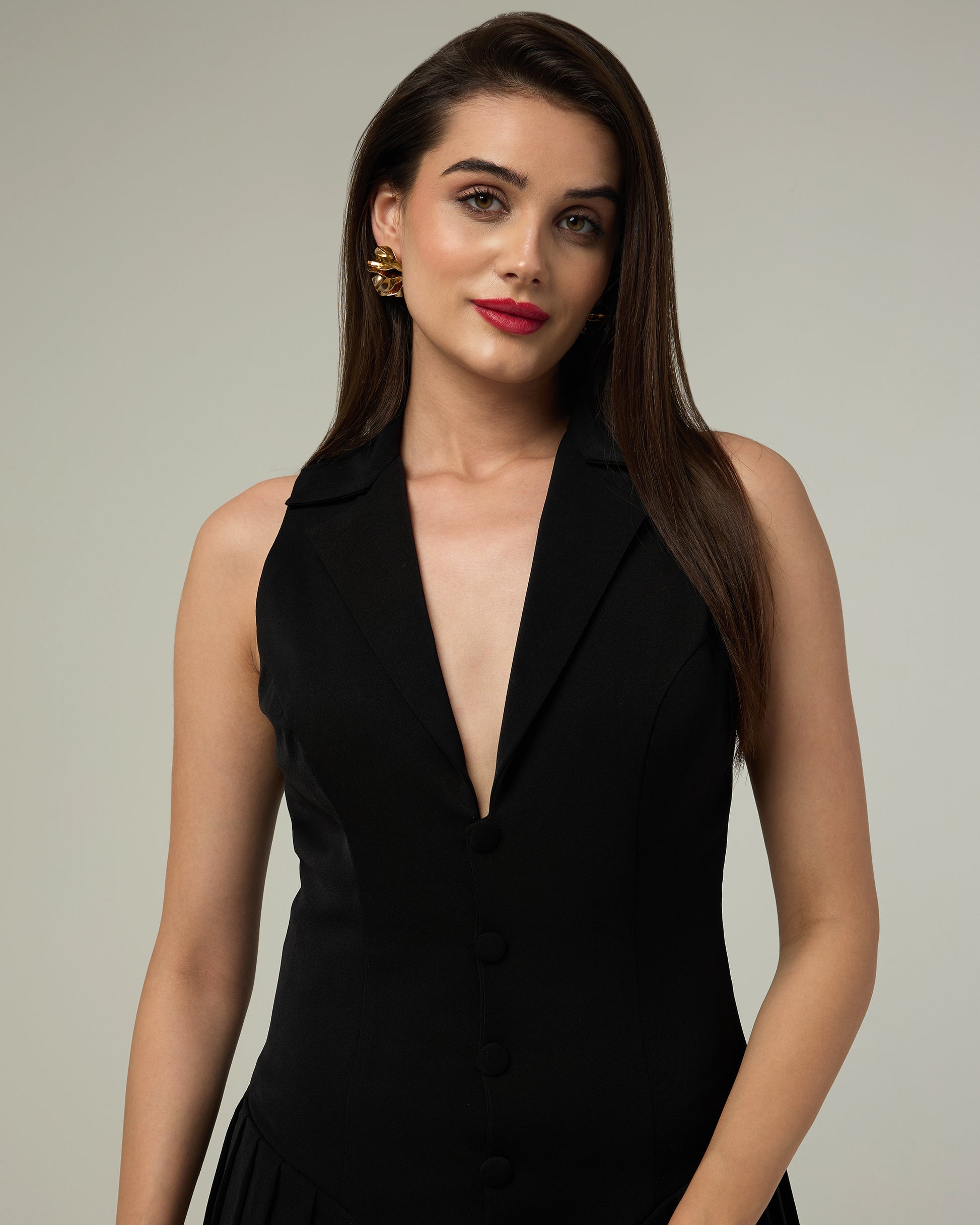 Sleek and sophisticated. This sleeveless black dress features a sharp lapel collar and a pleated skirt, adding a touch of elegance to your wardrobe.