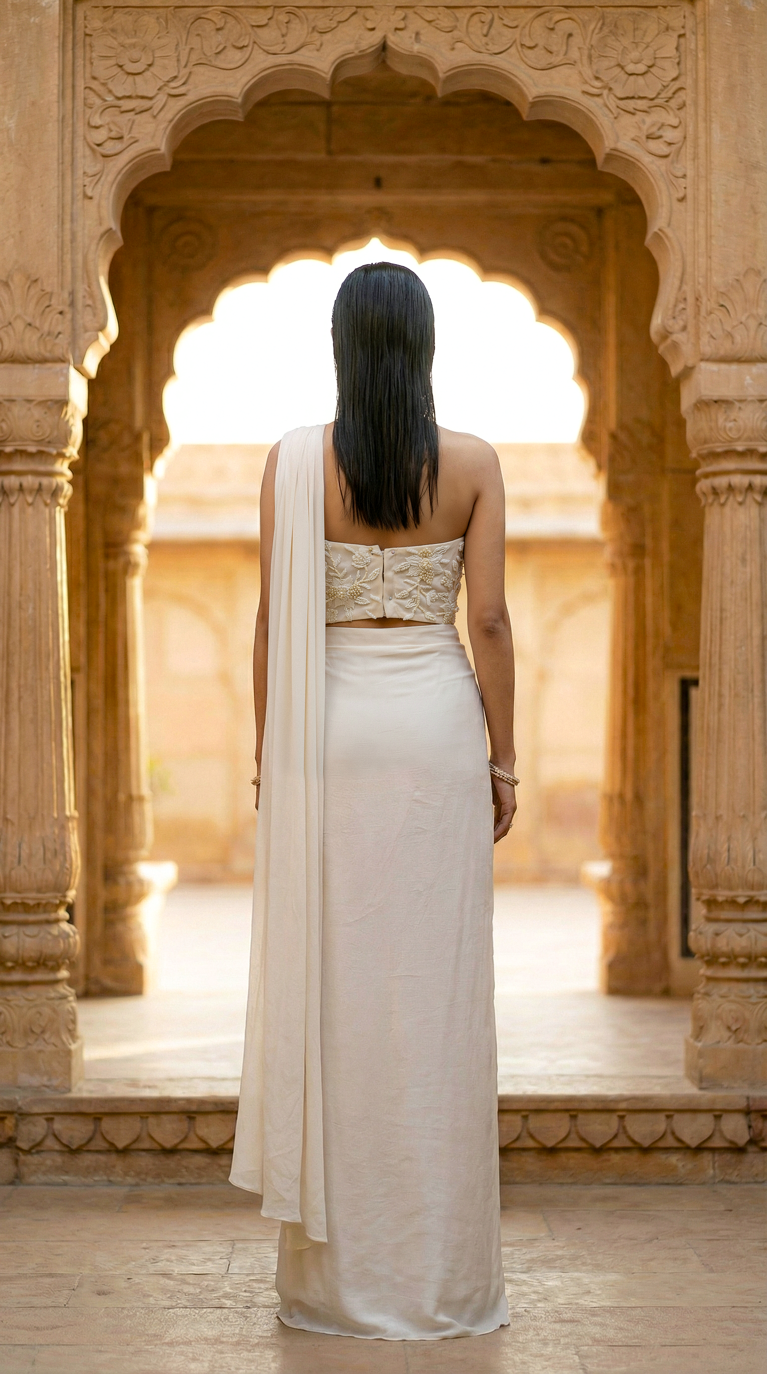 A sophisticated three-piece ethnic-fusion set featuring an ivory white draped skirt with soft pleats, a heavily embroidered corset-style crop top with a curved neckline, and a separate, detachable drape that is styled elegantly over one shoulder.