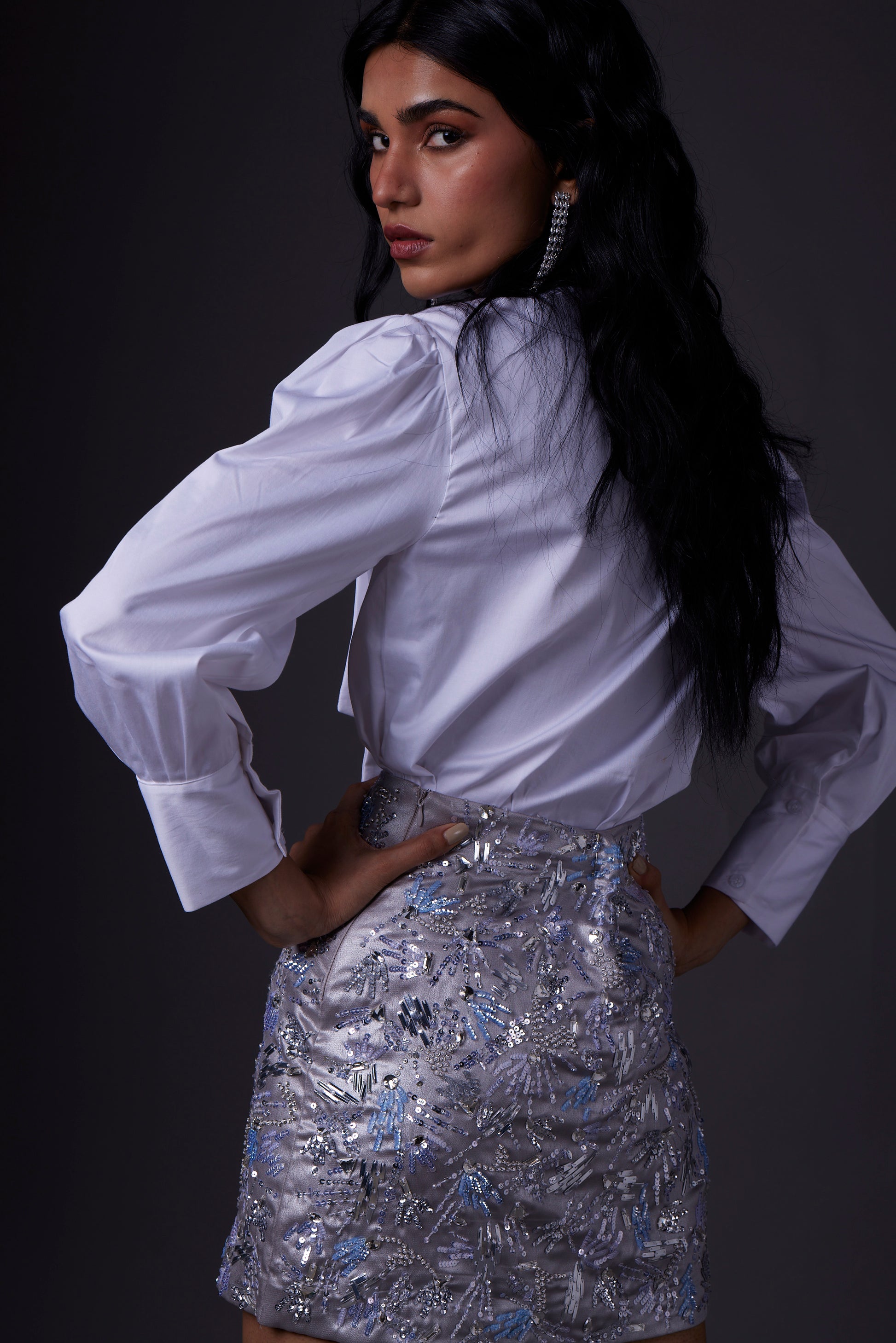 Silver sequin embroidered mini skirt with ice-blue accents and intricate handwork on satin base, offering a chic, luxe statement.