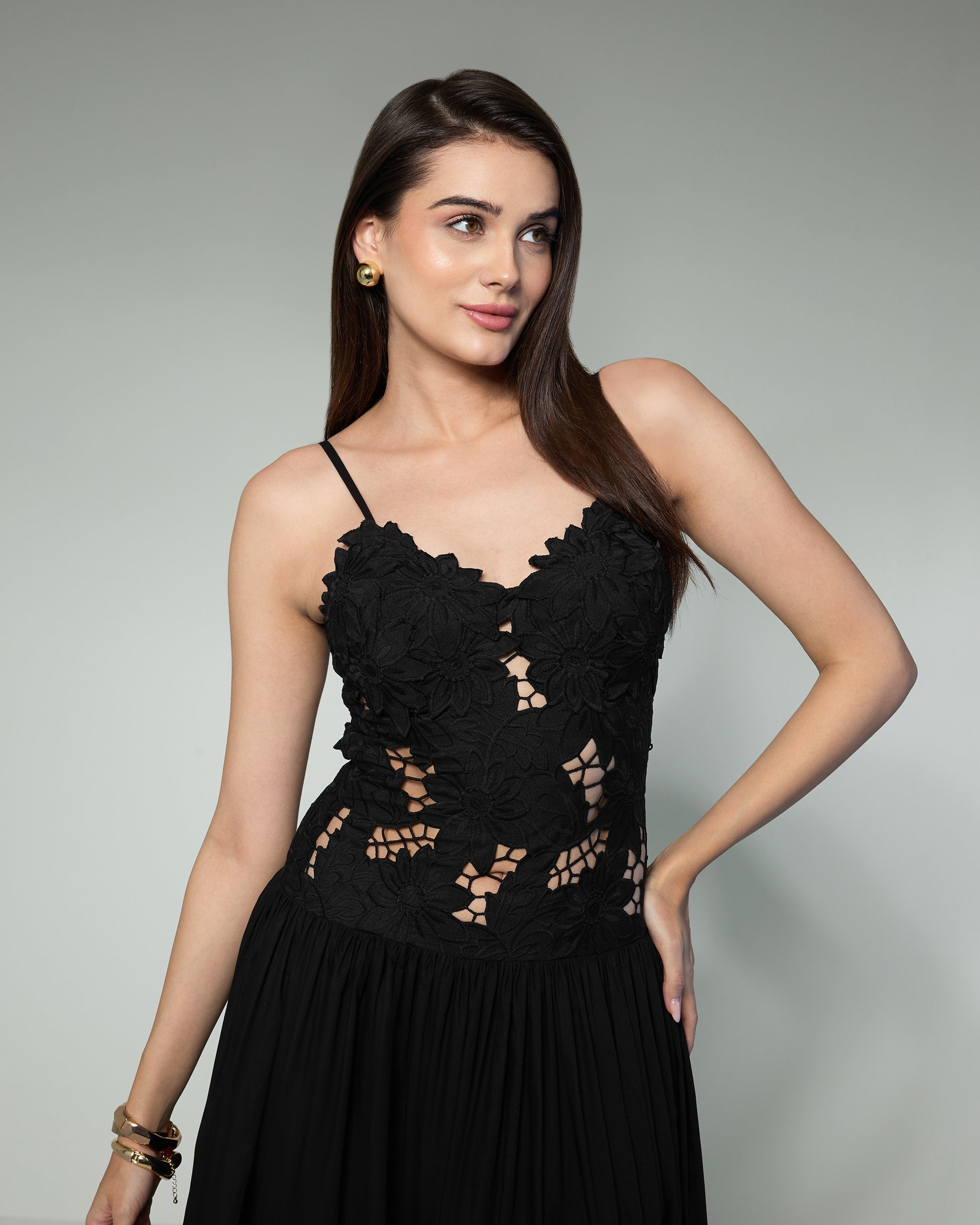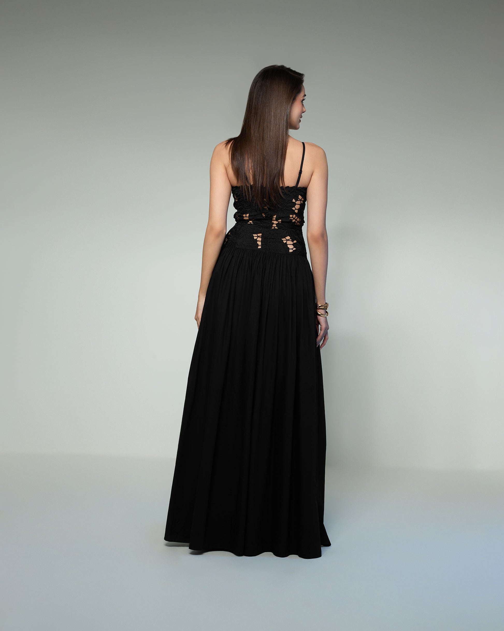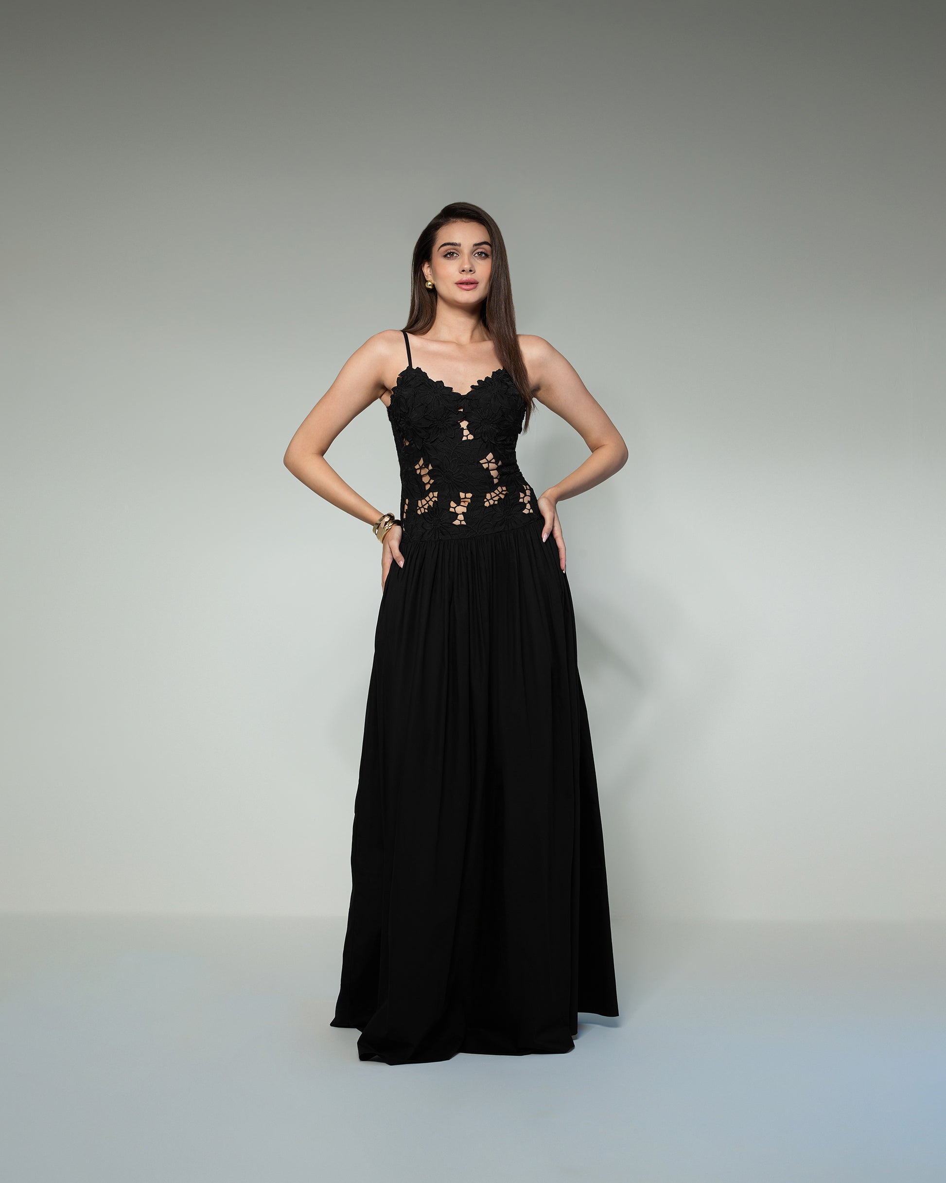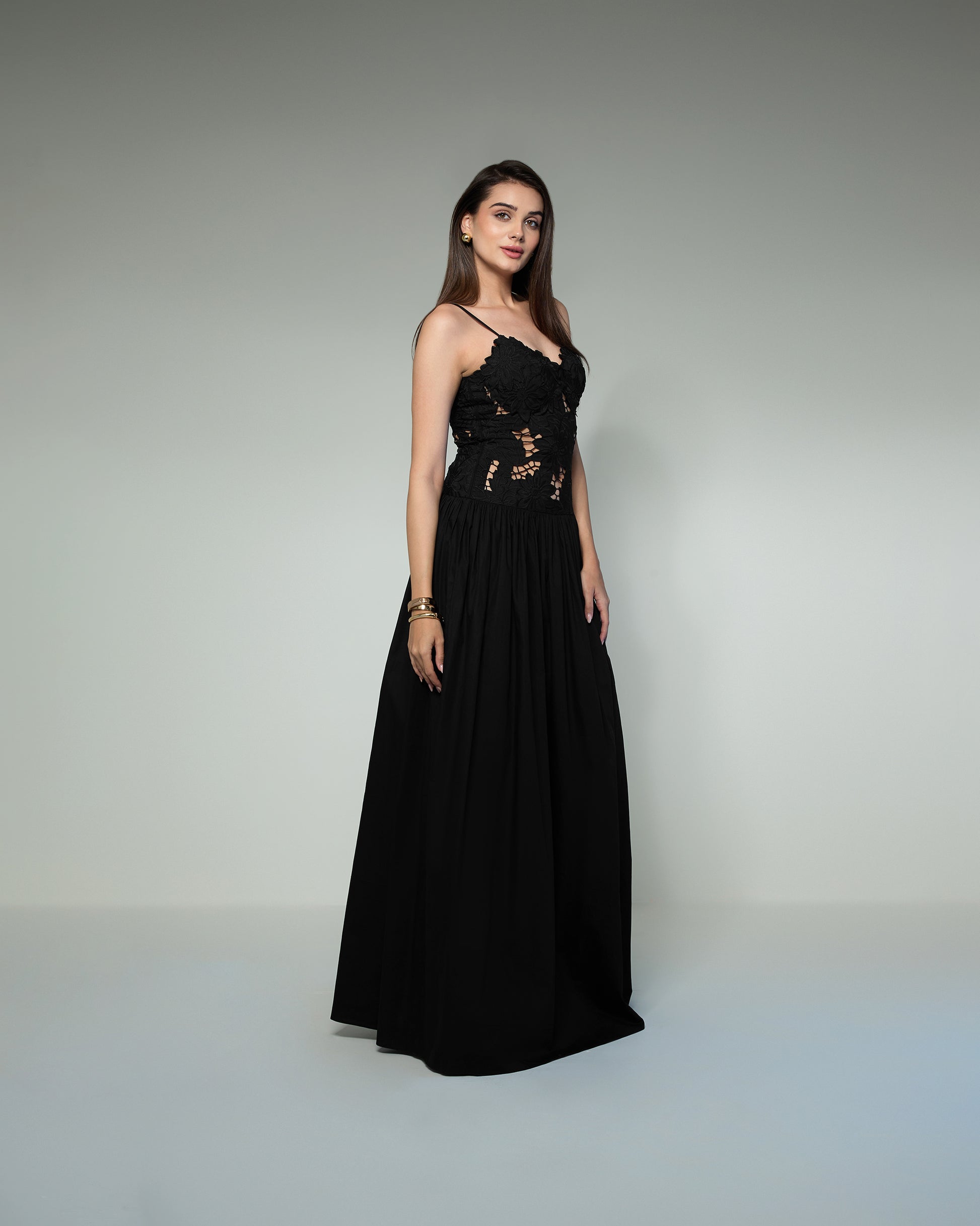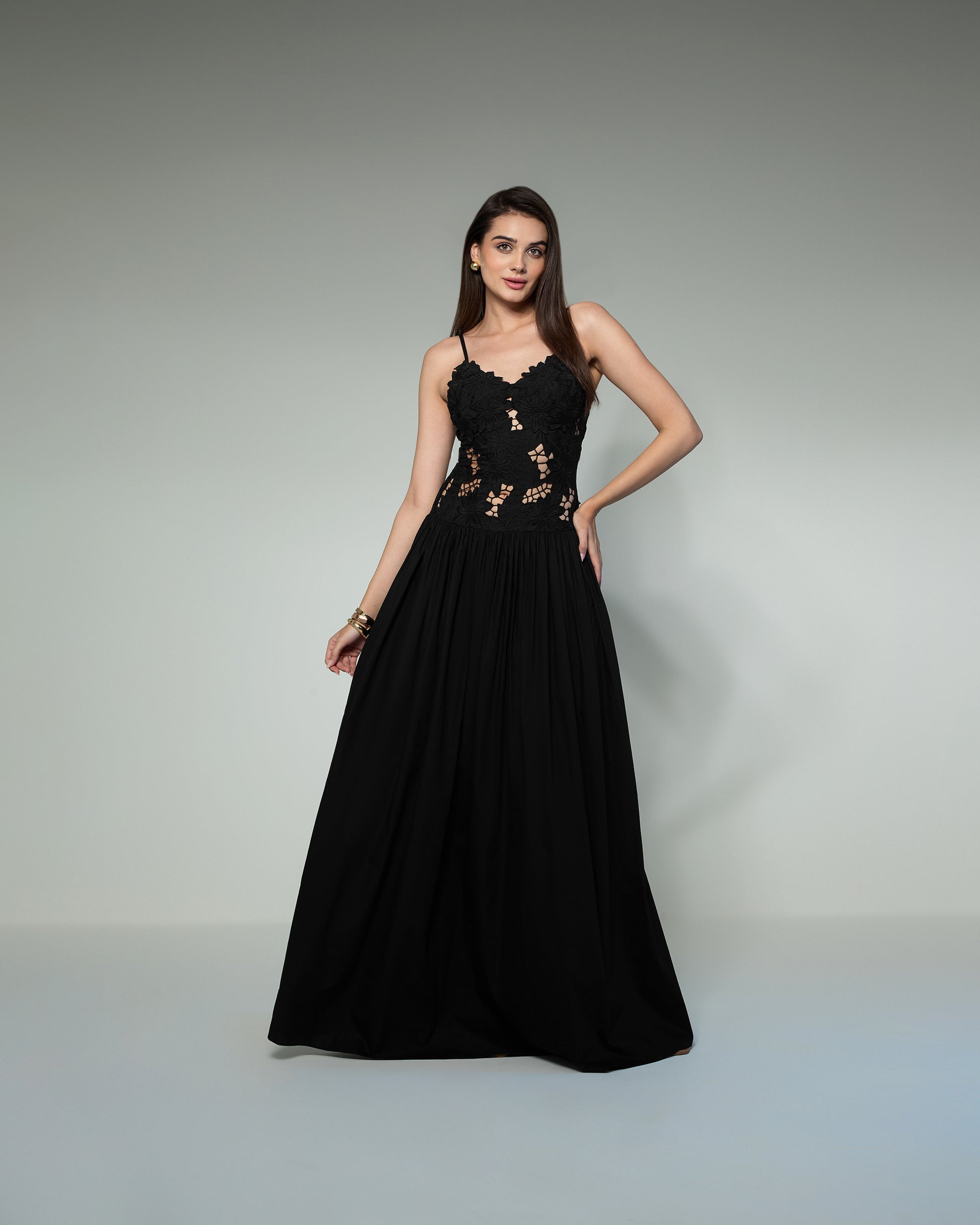 A captivating black evening gown that blends romance with modern elegance. The bodice features delicate floral lace appliqué with intricate cutwork, offering a subtle hint of allure. Slim spaghetti straps frame a softly scalloped neckline, while the flowing, floor-length skirt in lightweight cotton gracefully from the waist, creating an elongated silhouette. This gown is perfect for formal soirées, galas, or black-tie events, exuding timeless sophistication with every step.