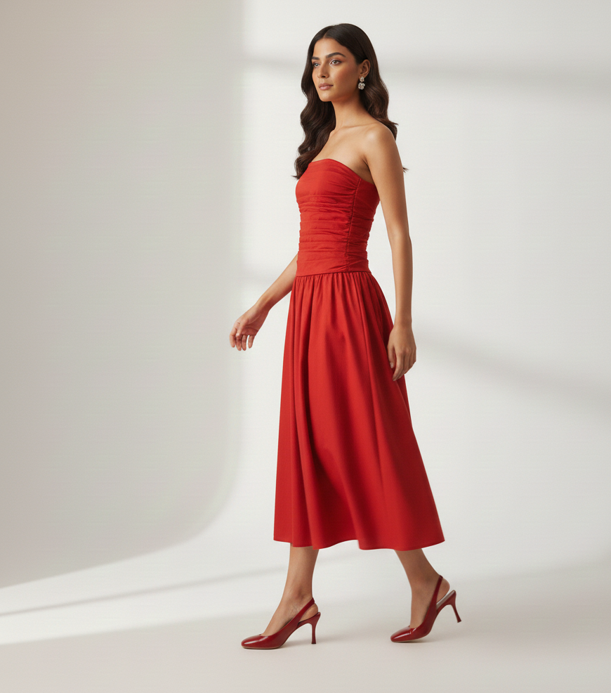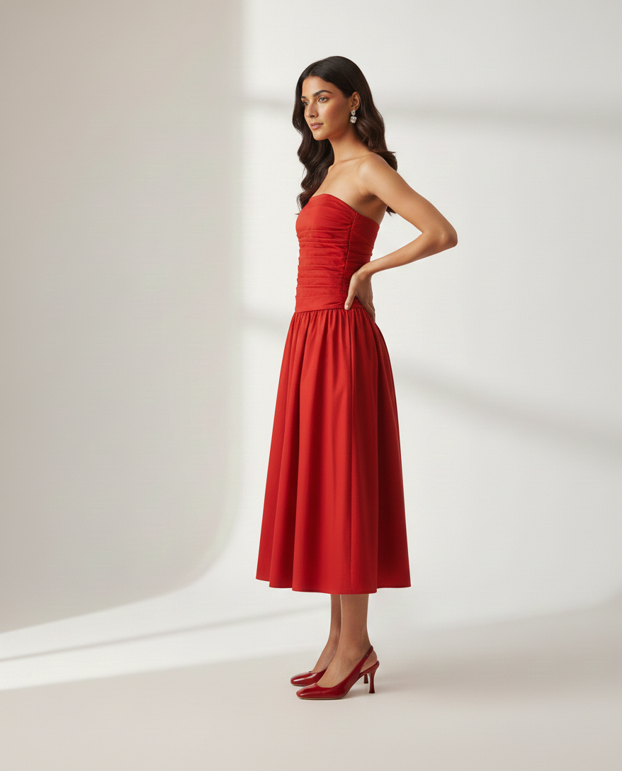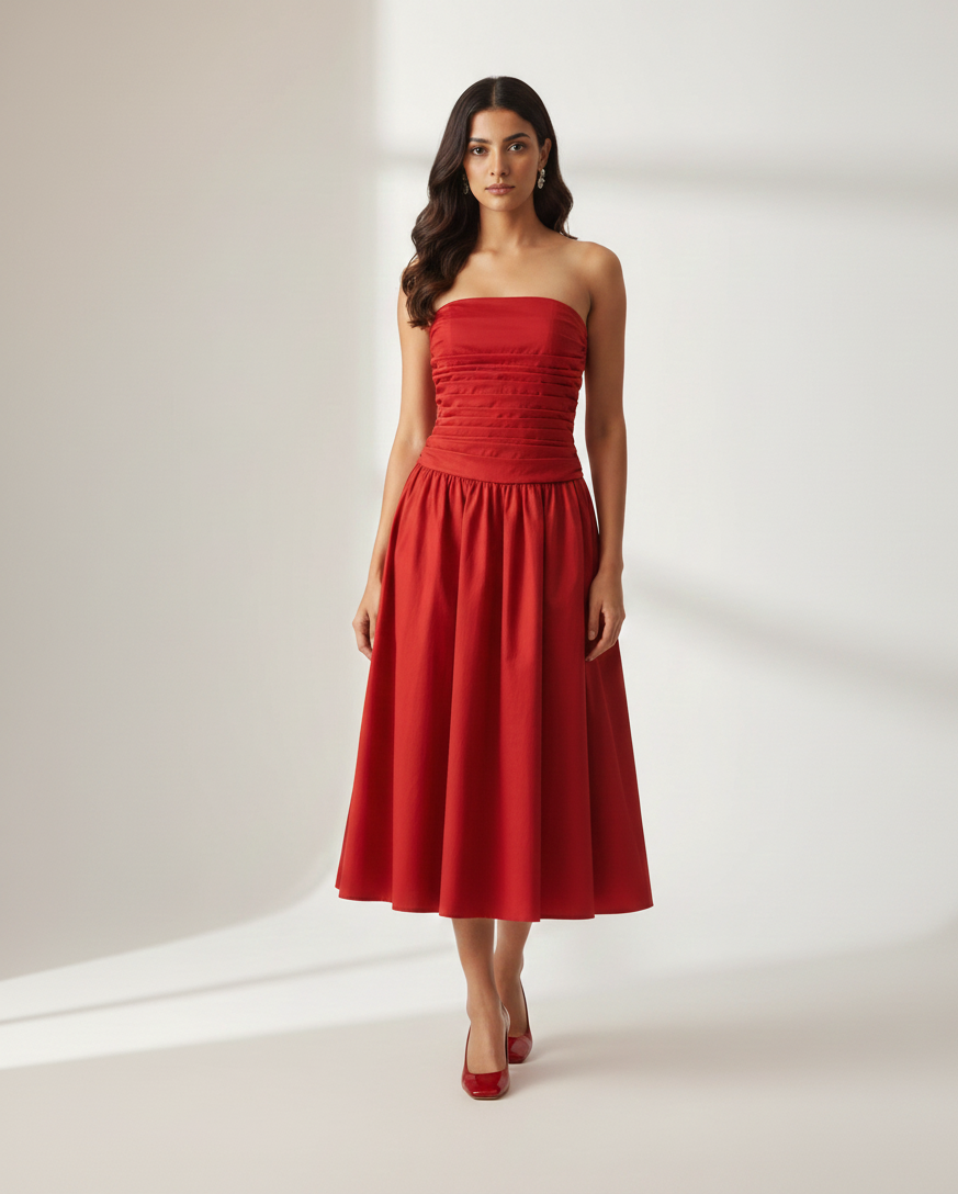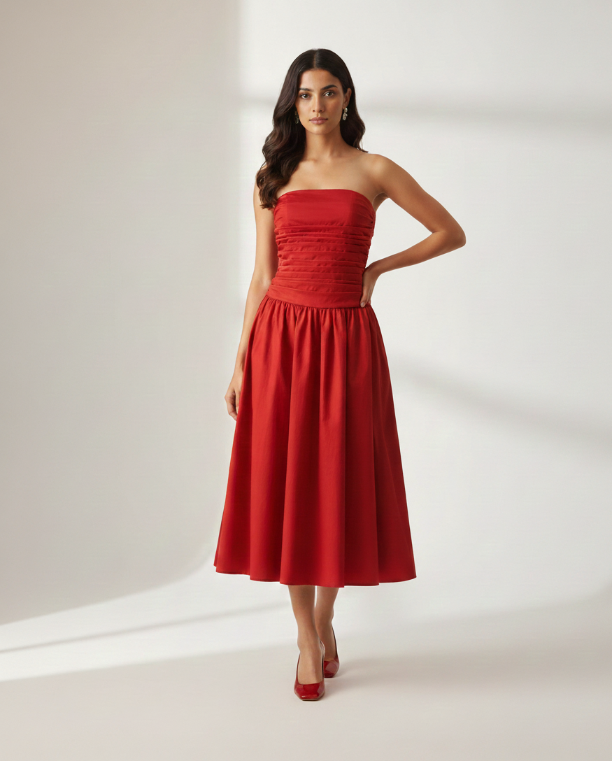 A timeless strapless midi dress in a rich scarlet hue, sculpted with finely ruched bodice detailing that contours the torso beautifully. The softly flared skirt falls with graceful movement, balancing structure and fluidity for an effortlessly elegant silhouette. Finished with a clean neckline and impeccable tailoring, this piece transitions seamlessly from refined daytime affairs to elegant evening soirées.